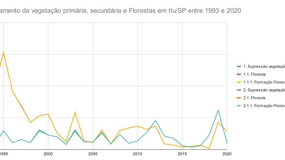 Gráfico do desmatamento da vegetação primária, secundária e das florestas em Itu/SP, entre os anos de 1993 e 2020. Fonte principal Projeto MapBiomas – Coleção 7 da Série Anual de Mapas de Cobertura e Uso